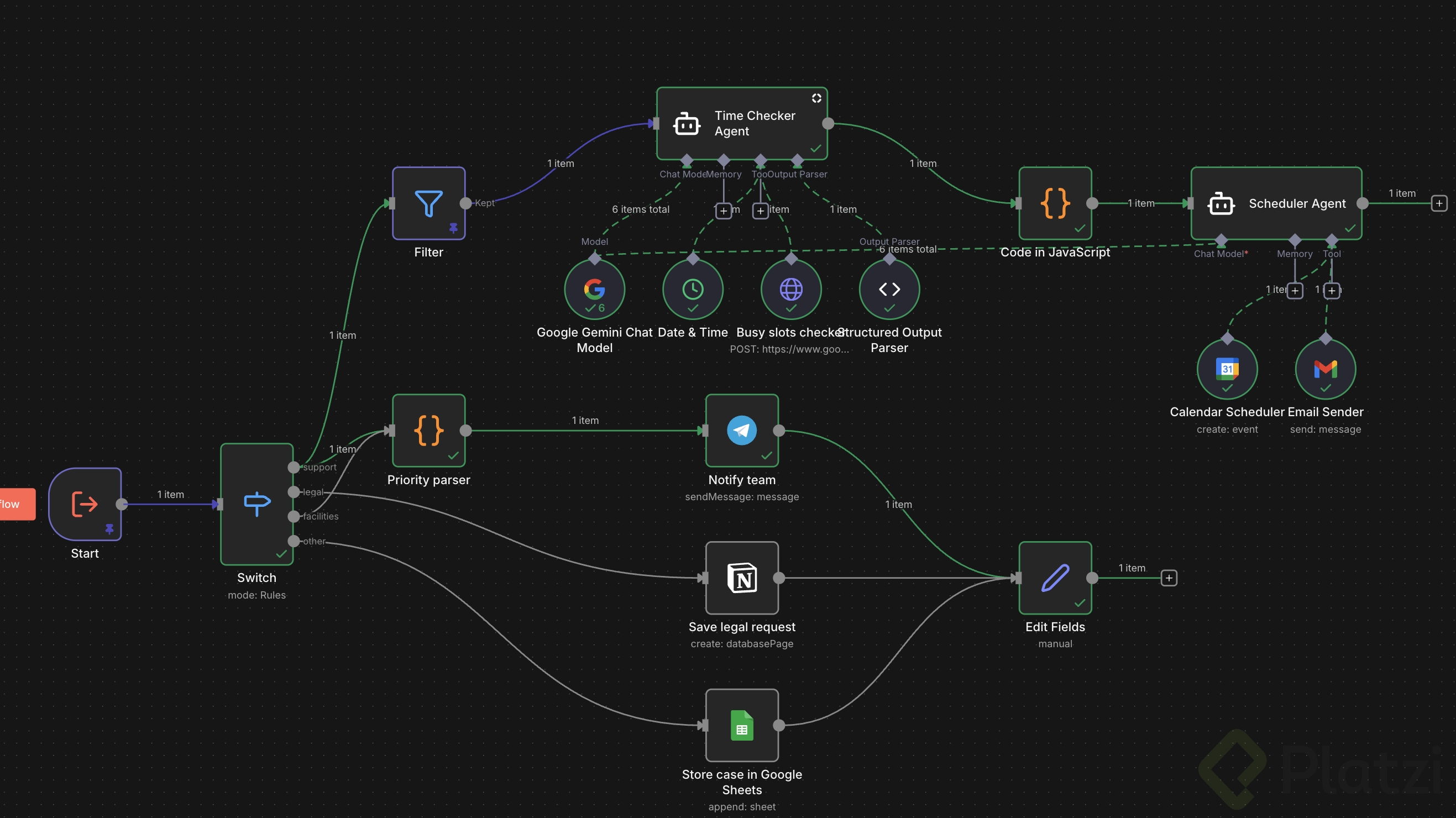 Para empezar, se construye un subflujo que notifica a distintos departamentos y se enfoca en la rama de IT con prioridad alta. La lógica se apoya en nodos como trigger, switch y filter, permitiendo rutas paralelas y condiciones precisas.