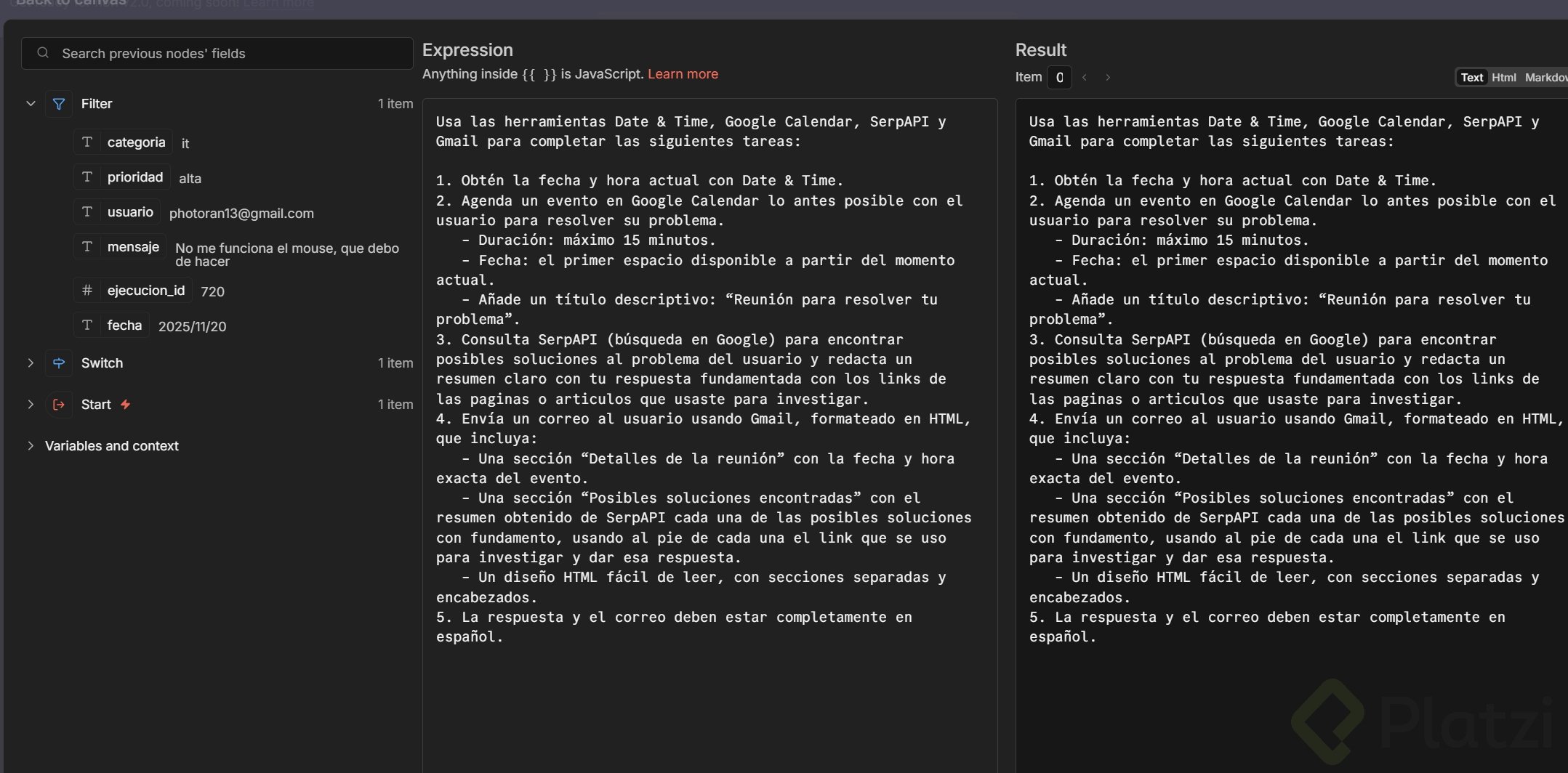 - Conecta los nodos y habilita que la IA autocomplemente la información de usuario cuando falte.