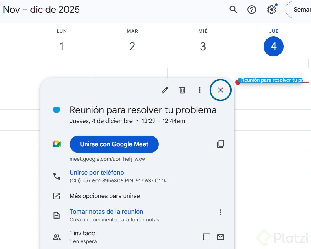 - Verifica en el calendario que el evento se creó correctamente.