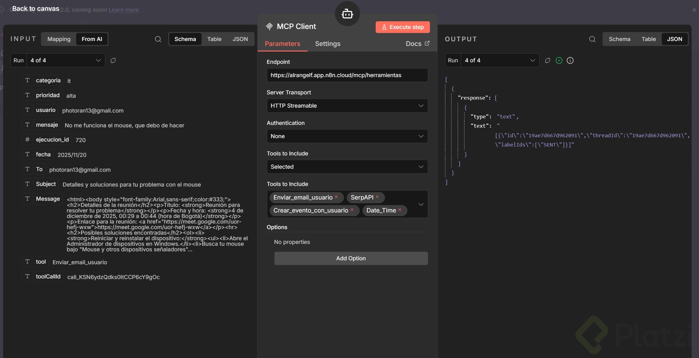Flujo final: el MCP server recibe la petición. Primero crea el evento en calendario. Luego busca en Google posibles soluciones. Por último, envía un correo con ambas cosas.