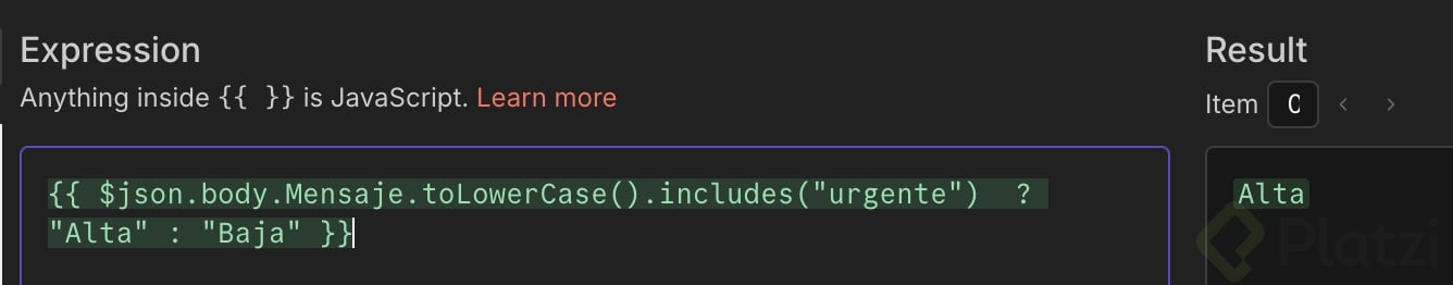 - Usa expresiones JavaScript: si el mensaje contiene “urgente”, asigna “alta”; de lo contrario, “baja”.