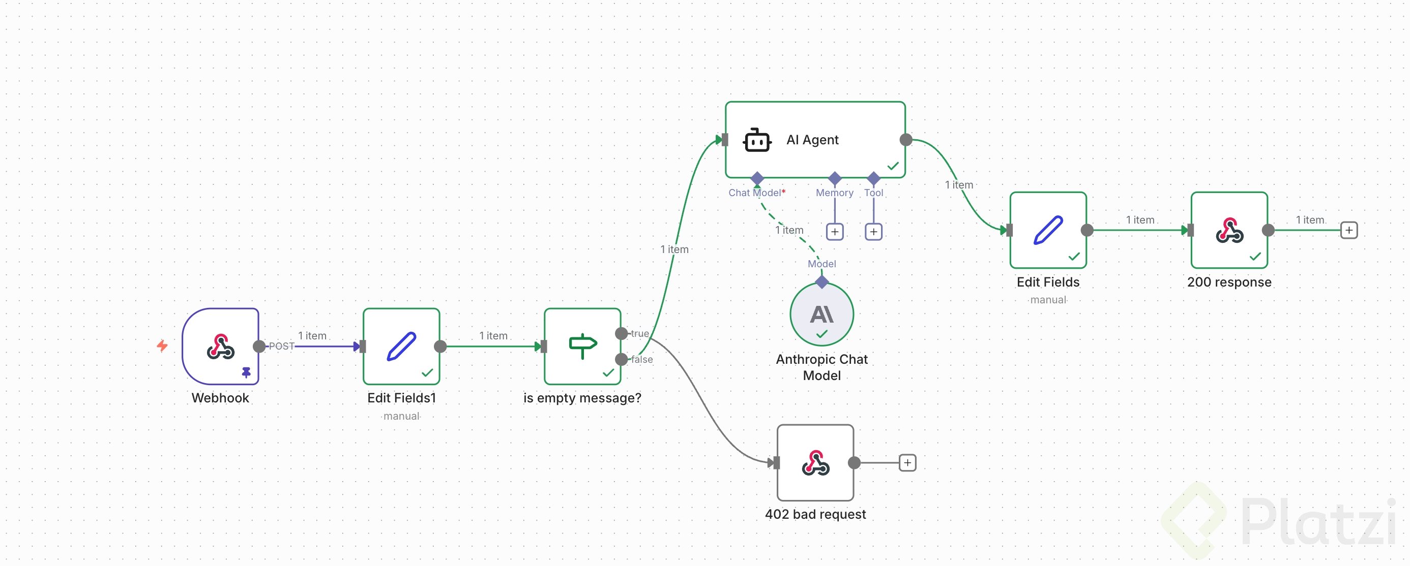 - Si no hay respuesta inicial, agrega respond to webhook y vuelve a ejecutar.