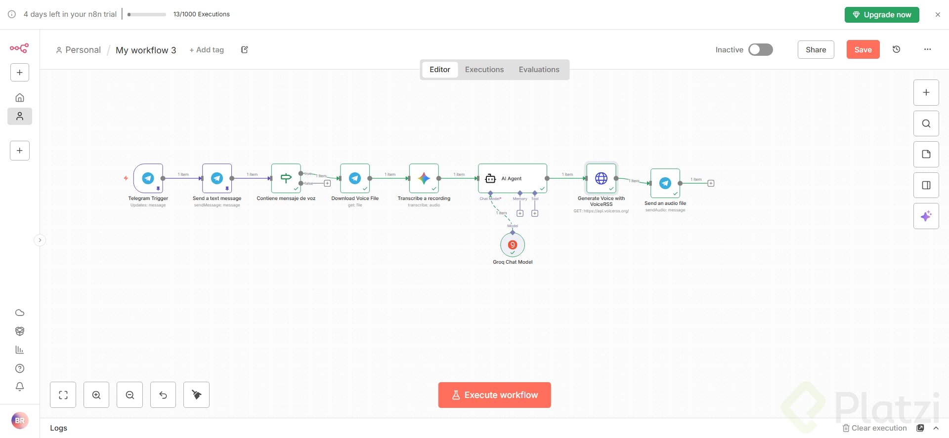 - Ejecuta y verifica que llega un audio de respuesta con el resumen. Finalmente, activa el workflow para pasar a producción.
