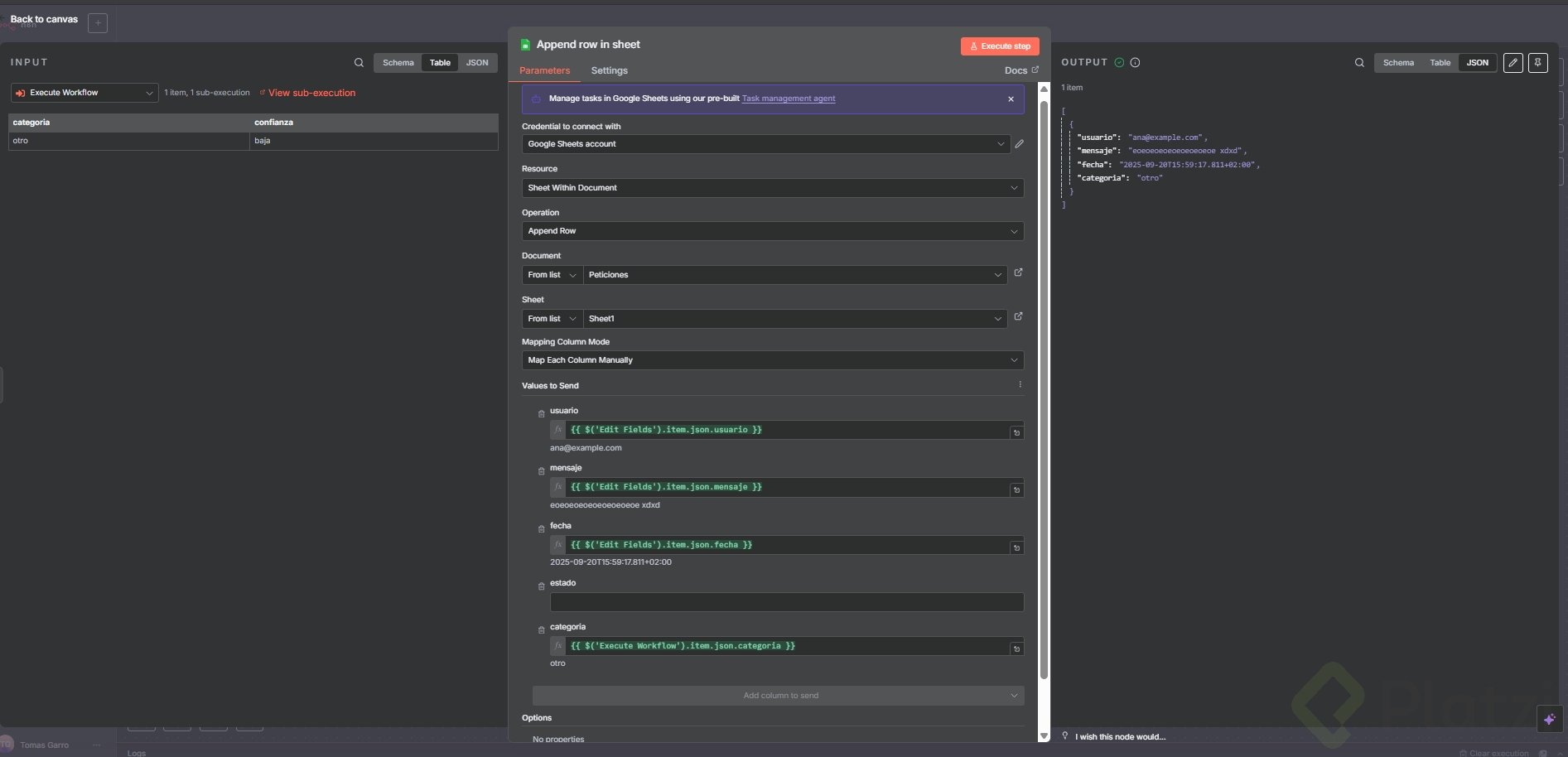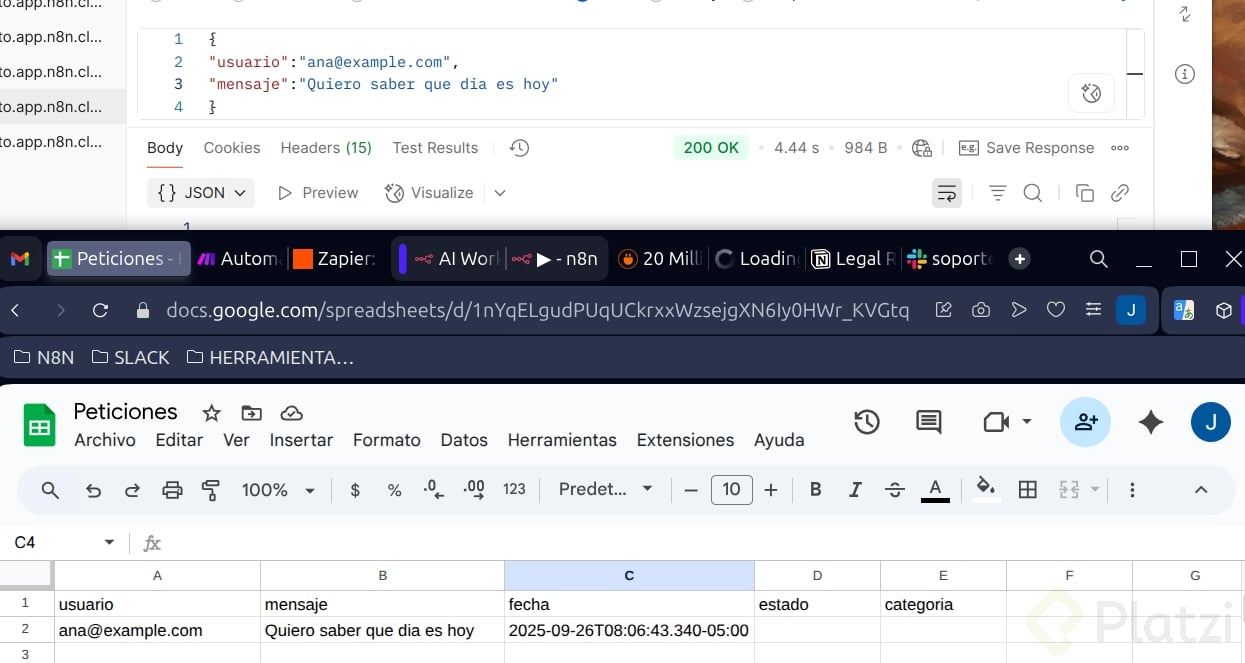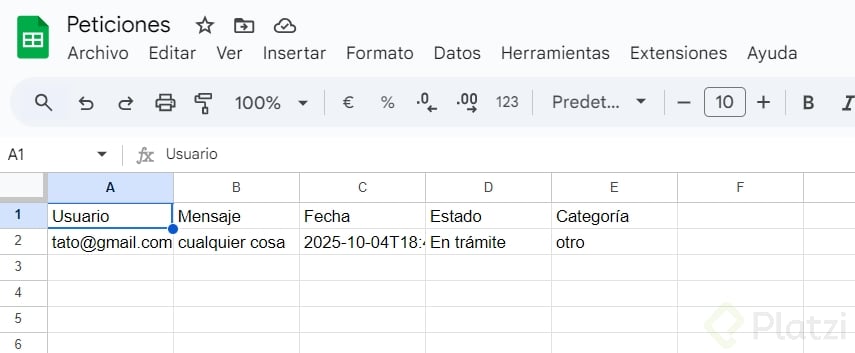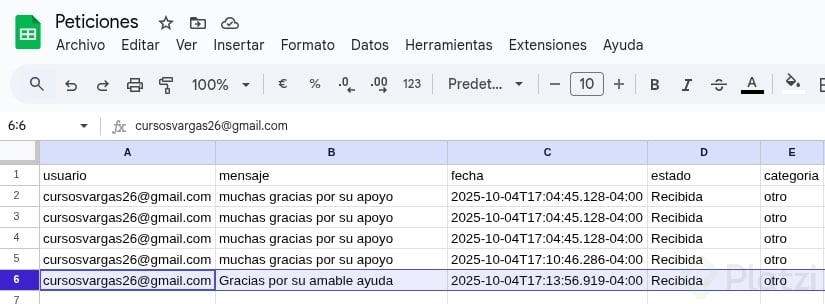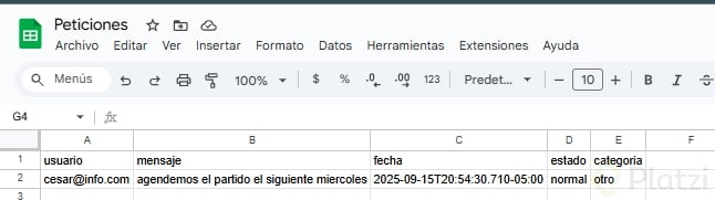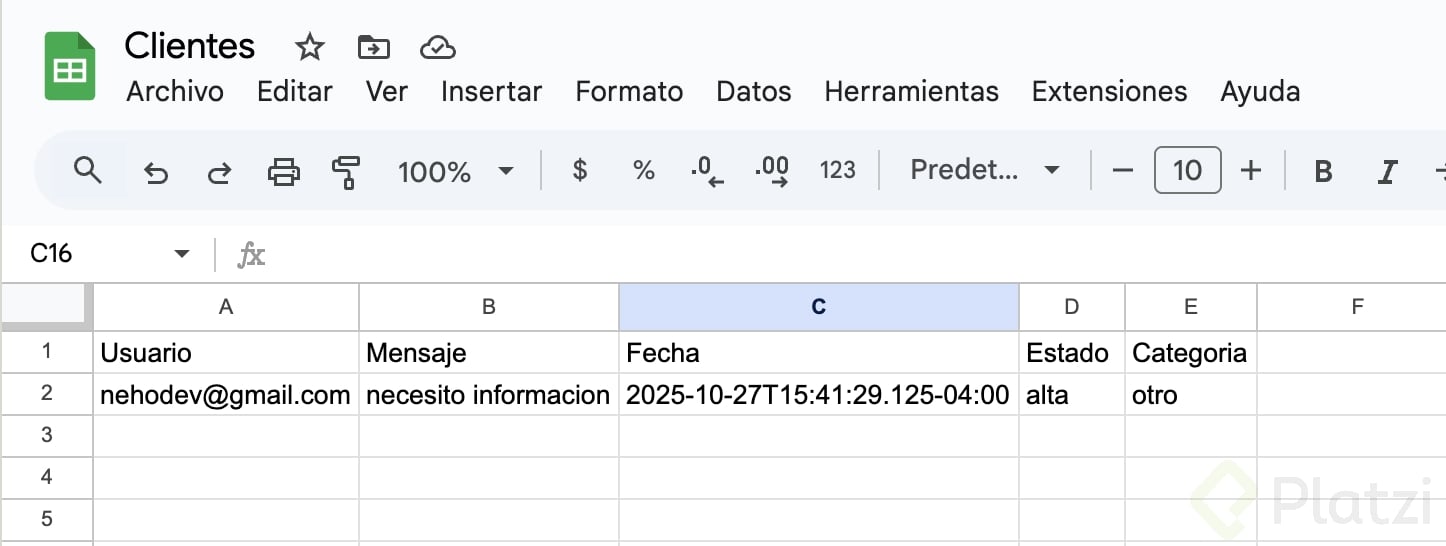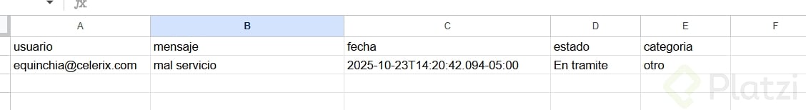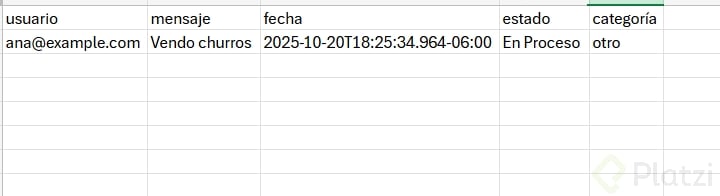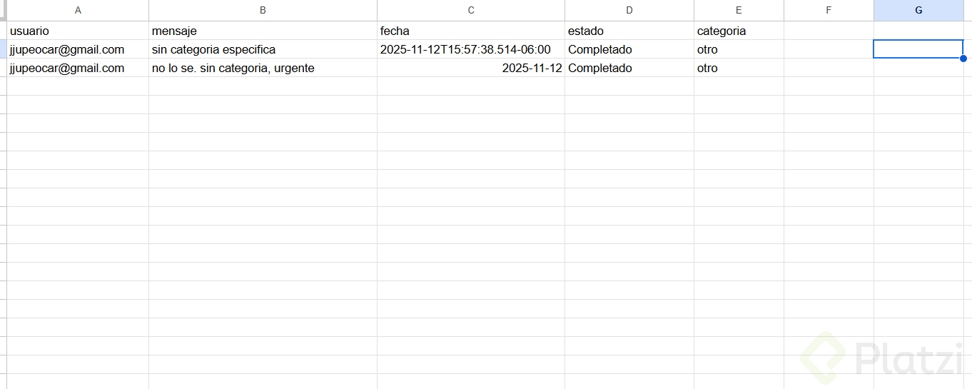 - Para el fallback, conecta a Google Sheet con columnas: usuario, mensaje, fecha, estado y categoría. Tómalo como reto y comparte evidencia.