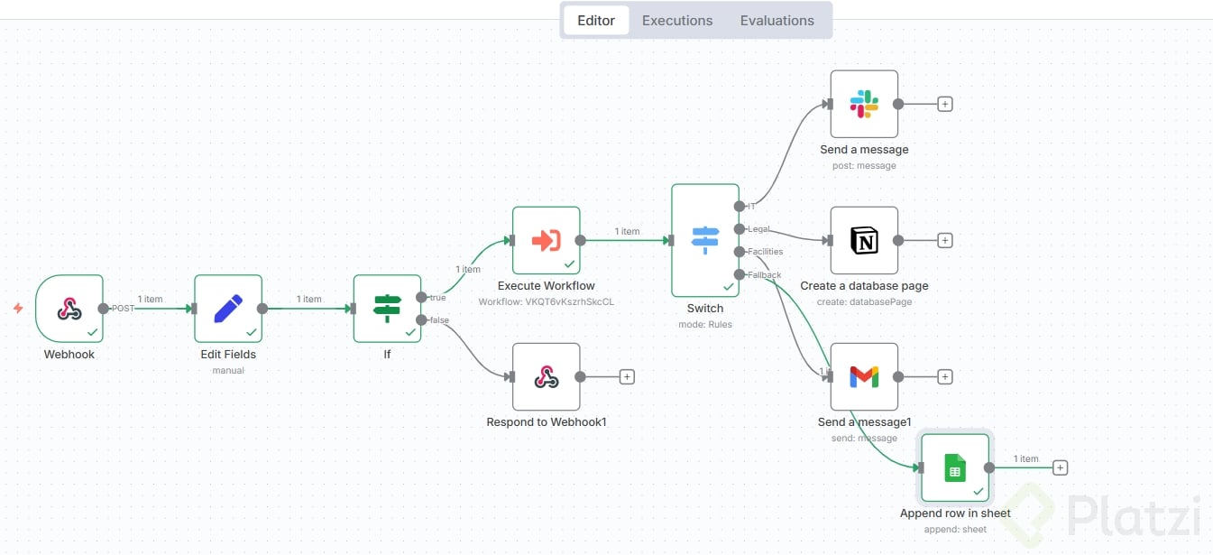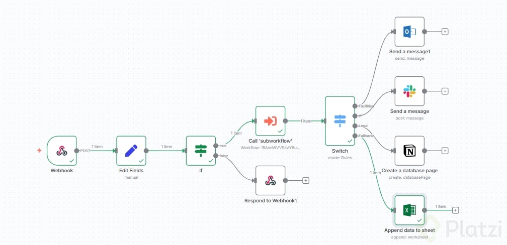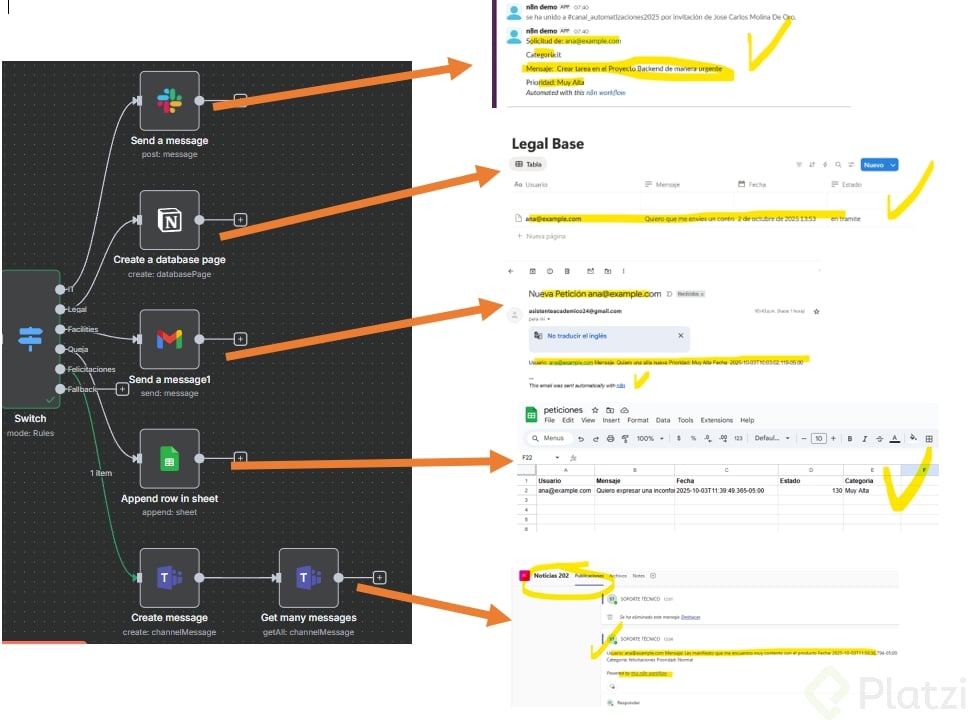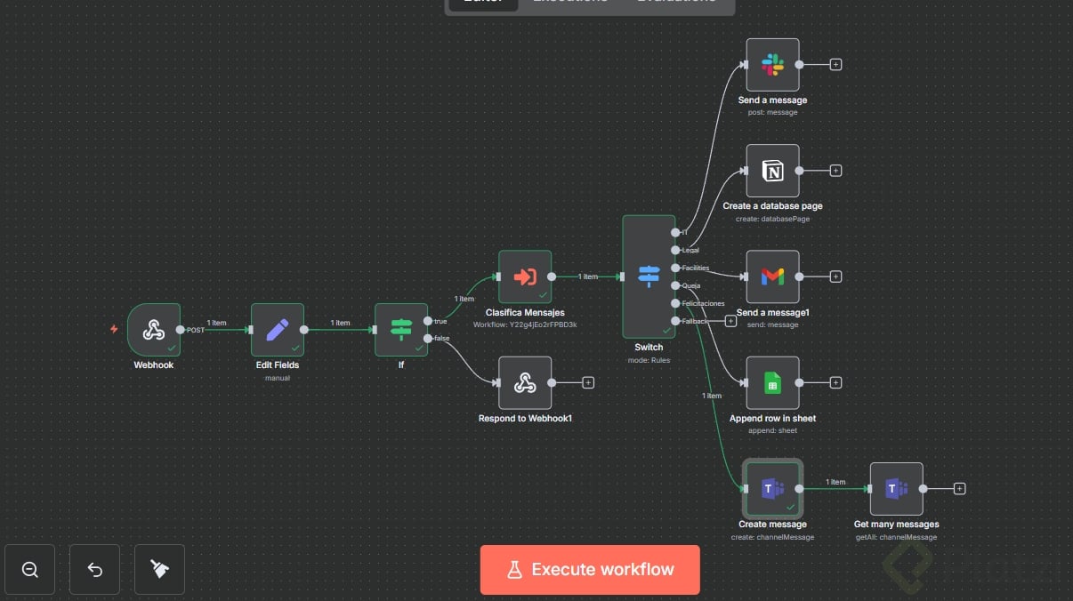 Cada ruta realiza una acción concreta y trazable. Usa credenciales, recurso y operación correctos en cada nodo. Mantén los mensajes y registros con campos consistentes: usuario, mensaje, prioridad, fecha y categoría.