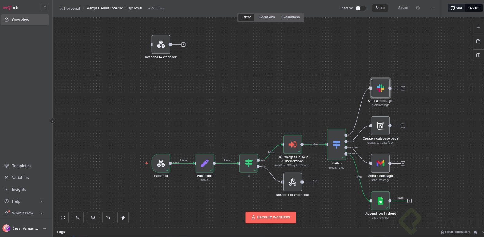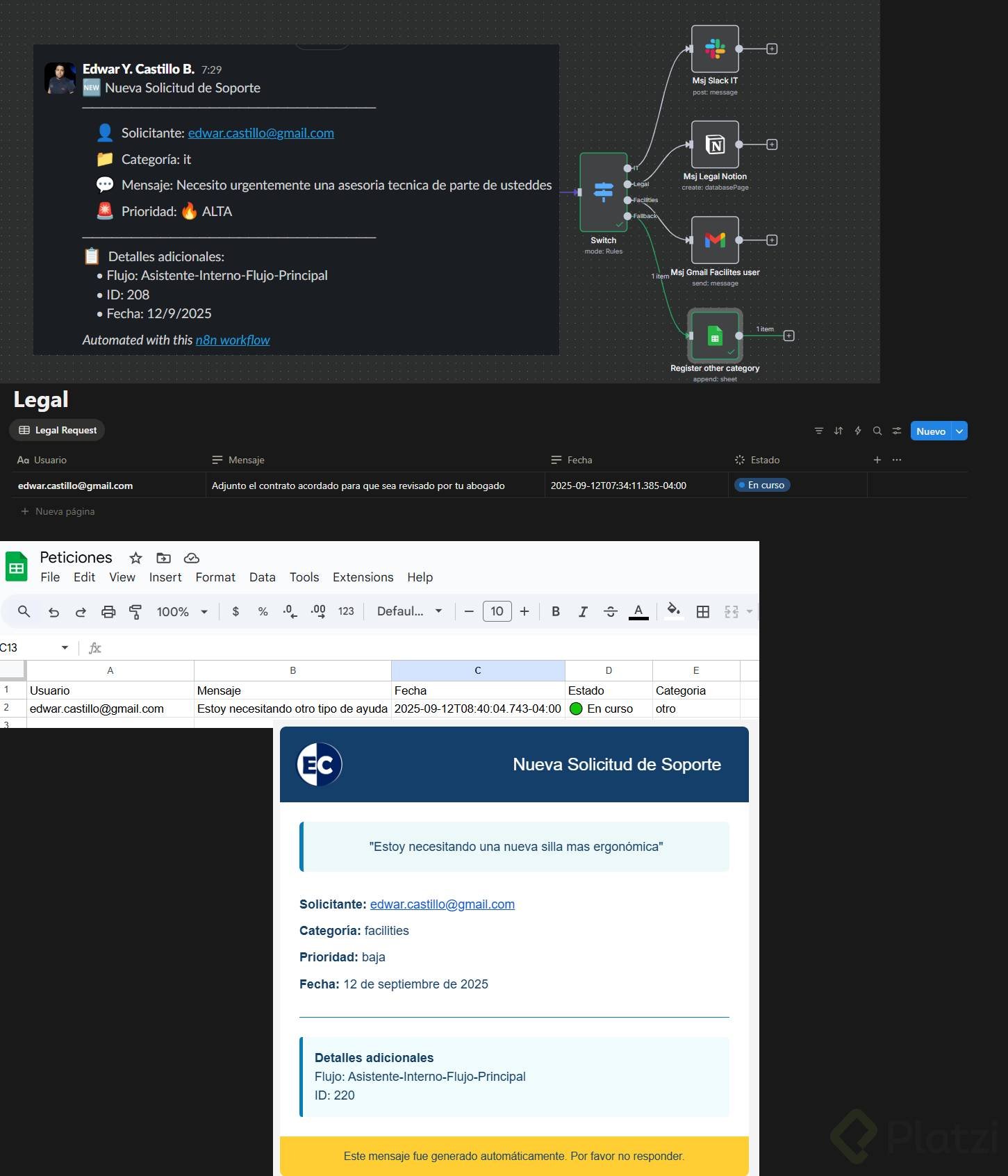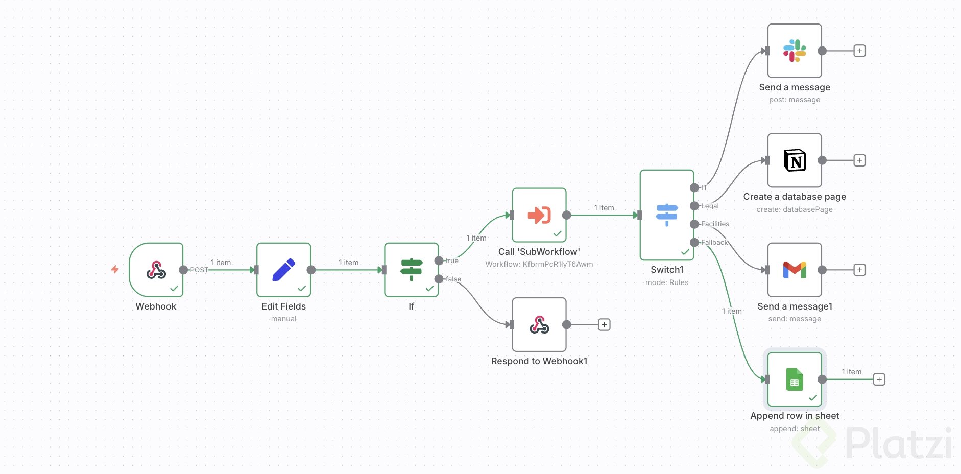 Cada ruta realiza una acción concreta y trazable. Usa credenciales, recurso y operación correctos en cada nodo. Mantén los mensajes y registros con campos consistentes: usuario, mensaje, prioridad, fecha y categoría.