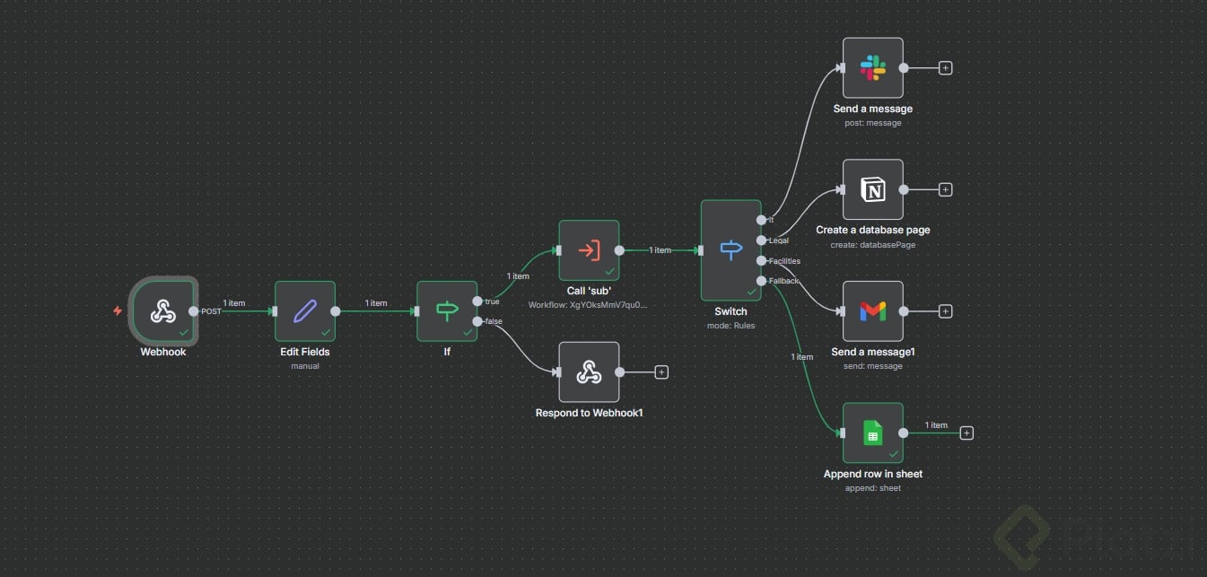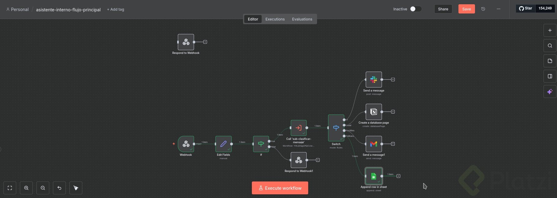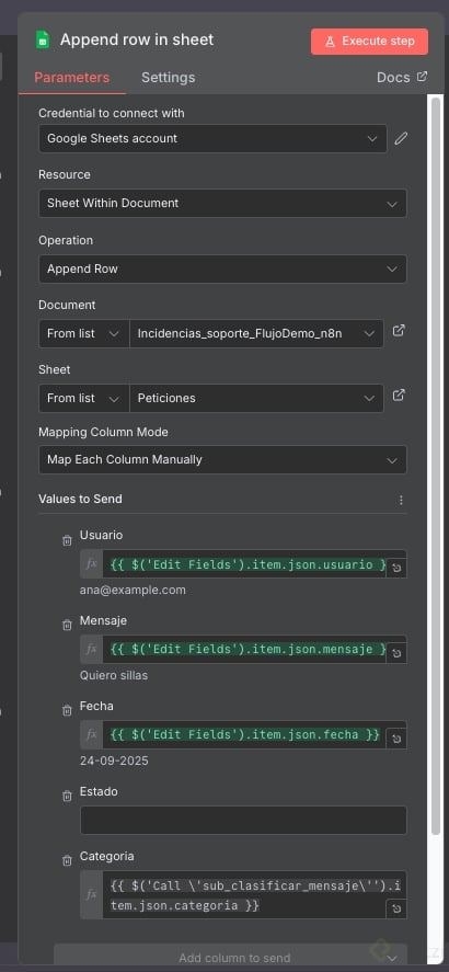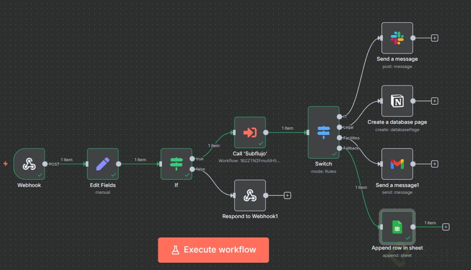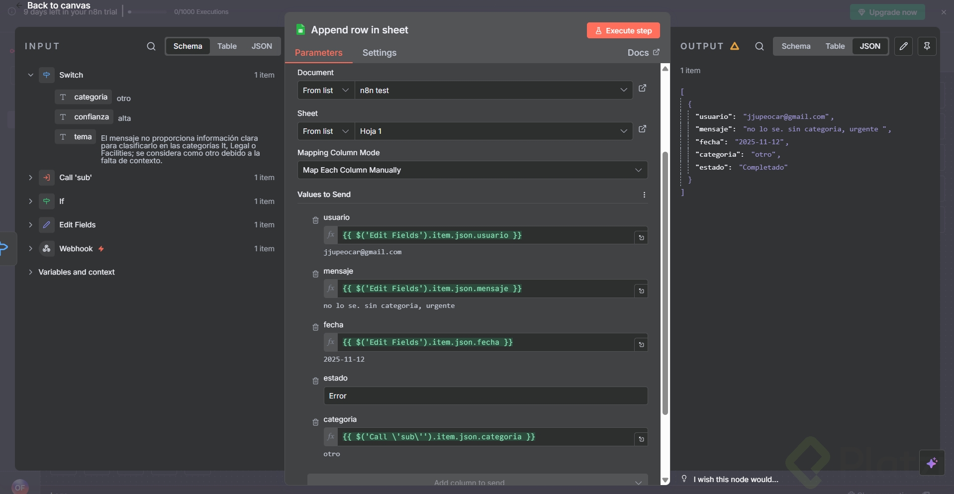 - Si no hay categoría, confirma que la IA clasificadora está conectada antes del switch.