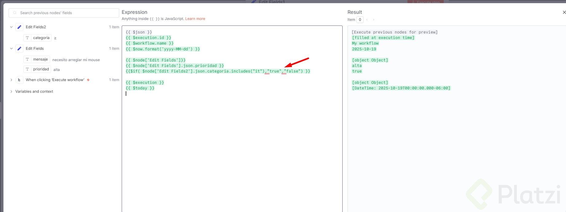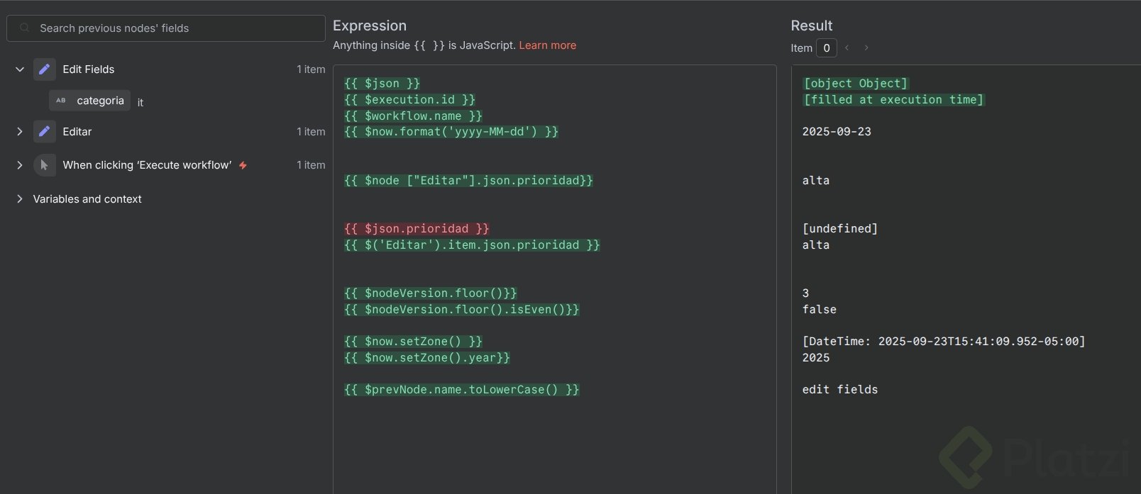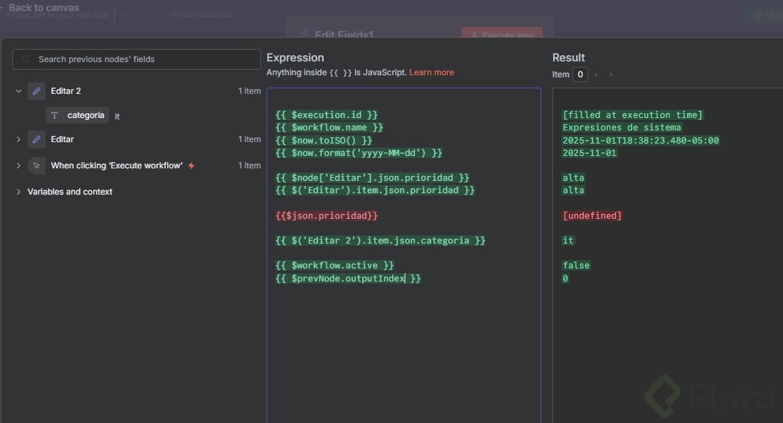 categoría: IT. - Ejecuta el workflow y observa cómo $json se rompe mientras $node sigue correcto.