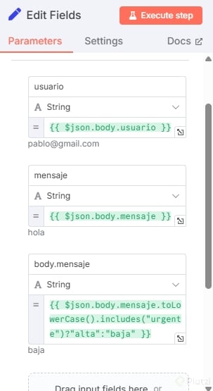 - $json apunta al nodo previo conectado.
