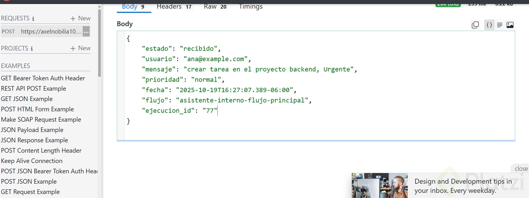 Suma contexto a la respuesta agregando Fecha, Flujo y Ejecución_id. Trabaja con expresiones del sistema y devuelve un objeto claro. Esto aporta trazabilidad y mejora la lectura.