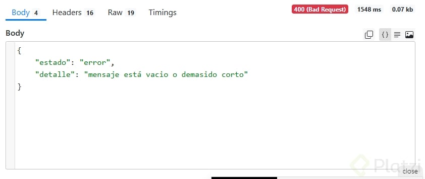 Maneja errores: indica cuando el mensaje está vacío o demasiado corto.
