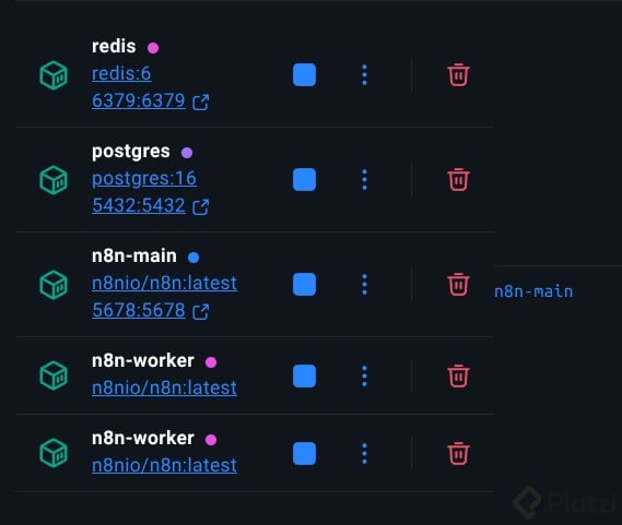 Duplica la definición de n8n main para crear n8n worker y ajusta su rol de ejecución.