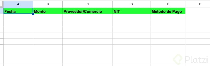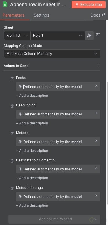 from AI(por ejemplo,{{ from AI(fecha) }}). - Asegurar que la configuración de cada columna (fecha, glosa, monto, proveedor o comercio, NIT y método de pago) concuerde exactamente con los datos provistos por el agente.