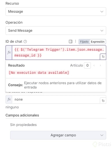 {{ $'triggerTelegram.item.json.message.messageID' }}. - El contenido del mensaje (text) se configura para enviar el resultado de la tarea del agente usando