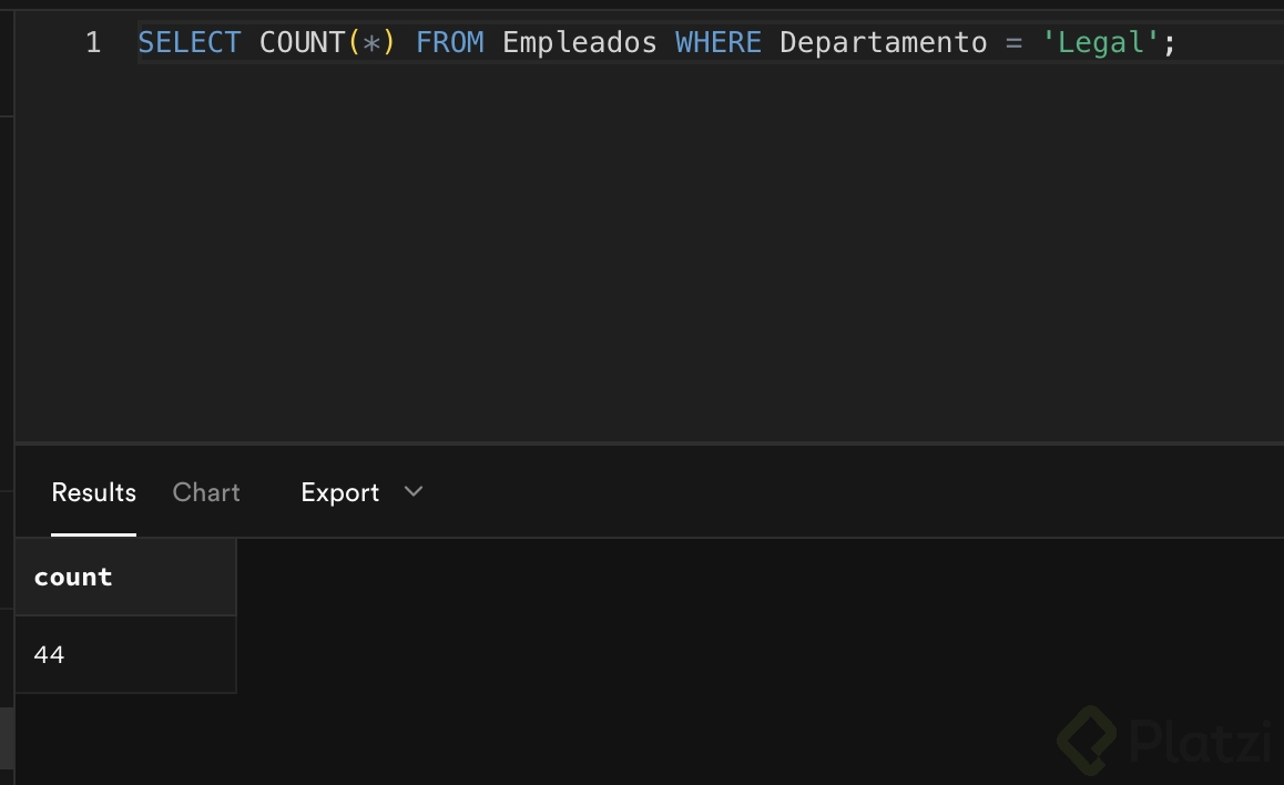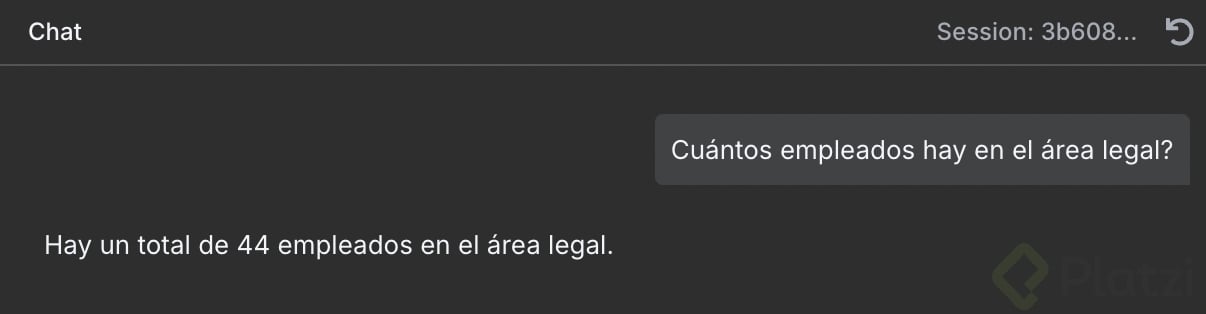 - Confirma que obtienes una respuesta adecuada, como: "en el área legal hay un total de quince colaboradores".