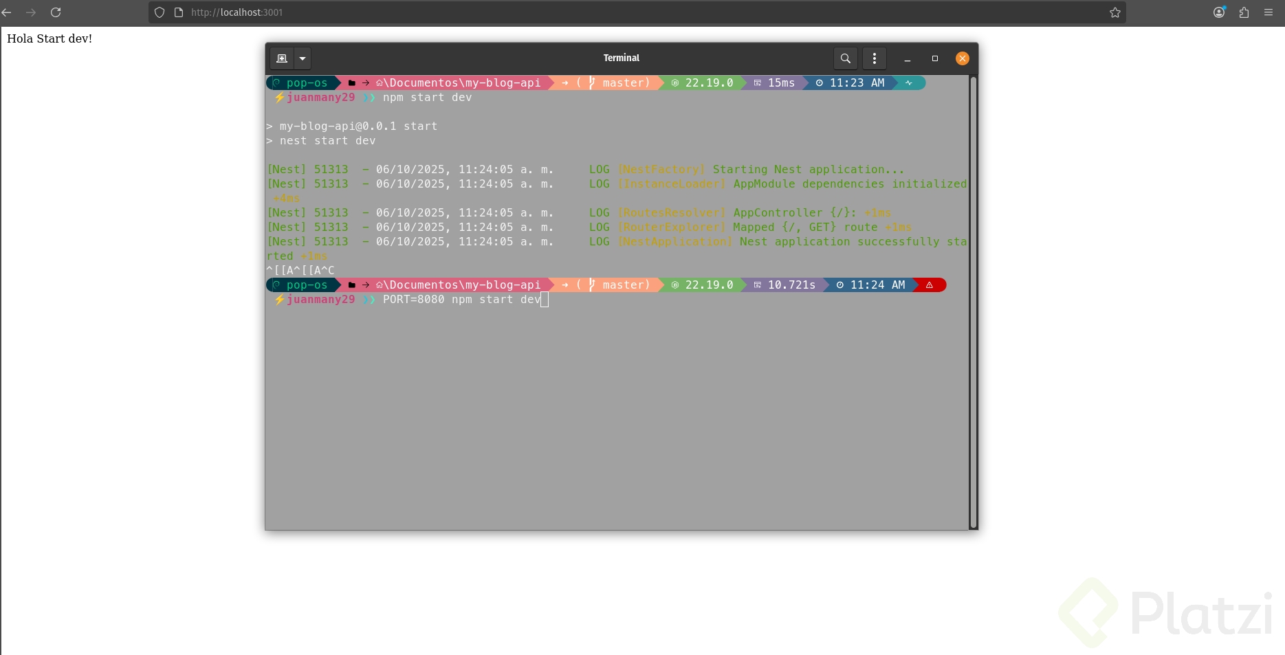 Esto inicia el servicio por defecto en el puerto 3000. Al ir a localhost:3000 verás un mensaje "Hello World" que confirma que todo funciona. Si cierras el servidor, el puerto dejará de responder: recuerda siempre correr el comando de inicio cuando desarrollas.