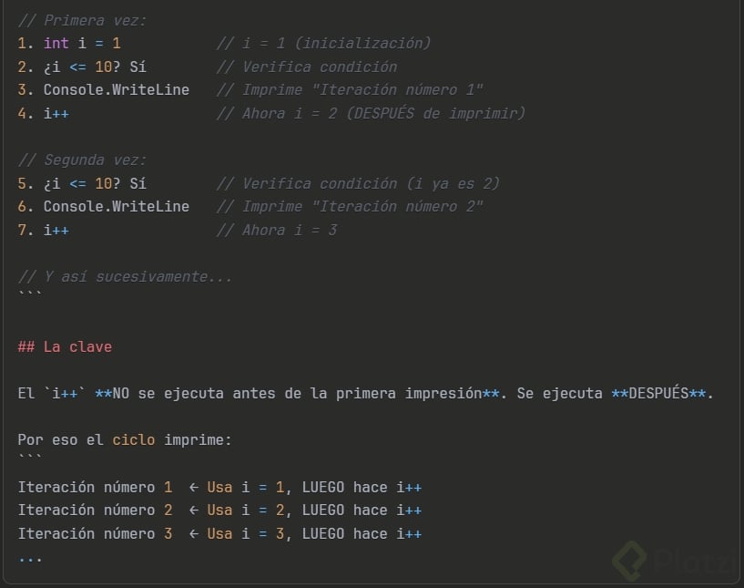 Console.WriteLine($"Contador: {i}"); // Muestra del 1 al 10