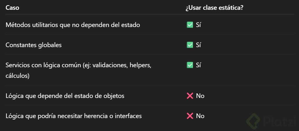 ¿En qué casos no deberías usar una clase estática?