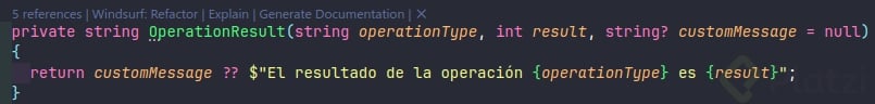 En el ejemplo expuesto, el método privado "resultado operación" maneja respuestas internas en formato cadena de caracteres (string). Se puede implementar de la siguiente manera: