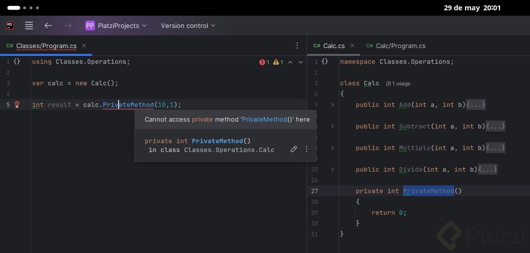- Un entorno visual, como puede ser Visual Studio o terminales de línea de comandos, arroja mensajes indicando que el método privado es inaccesible debido a su nivel de protección.