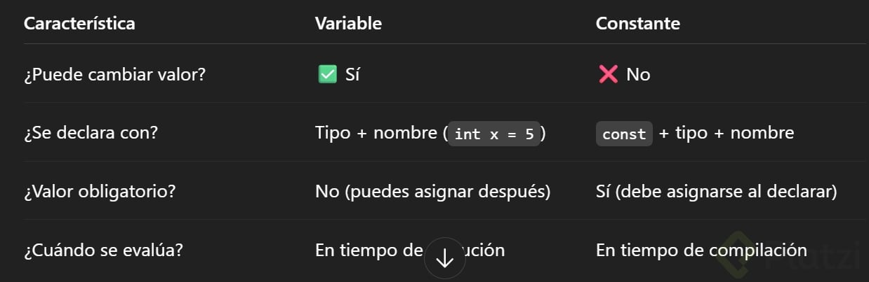 La principal diferencia está en la modificación de su valor una vez asignado. Si utilizas una constante (const), el valor debe tiparse desde su definición y no podrás modificarlo posteriormente. En cambio, una variable puede actualizarse sin problema durante la ejecución del programa.