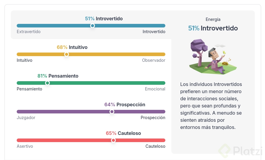 Además de Myers-Briggs, existe un test de autoconocimiento de la organización Five Thirty Eight que toma ideas previas y agrega más base científica. La invitación es a hacerlo, revisar tus gráficas principales y compartir solo lo necesario. Según lo señalado: 50 38 es “uno de los mejores tests con carácter científico en los últimos años”. Úsalo para entender qué tan abierto eres a nuevas experiencias y cómo conectas con otros desde tus emociones.