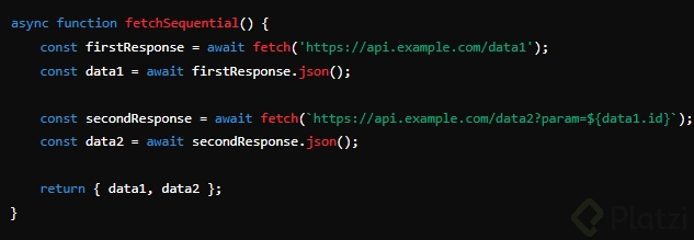 Fetching secuencial: Las solicitudes se realizan una detrás de otra, y una no comienza hasta que otra ha terminado. Esto es útil cuando un dato depende de otro. Por ejemplo, si necesitas obtener un producto específico utilizando un ID que primero debes obtener de una lista general de productos, entonces el fetching se realizaría de manera secuencial.