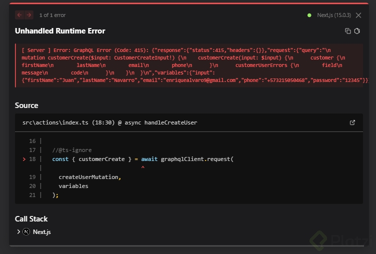 GraphQL Clientutilizando el singleton y almacena los datos de entrada en un objeto adecuado. - Asegúrate de eliminar campos innecesarios como la confirmación de contraseña antes de enviar los datos a Shopify.