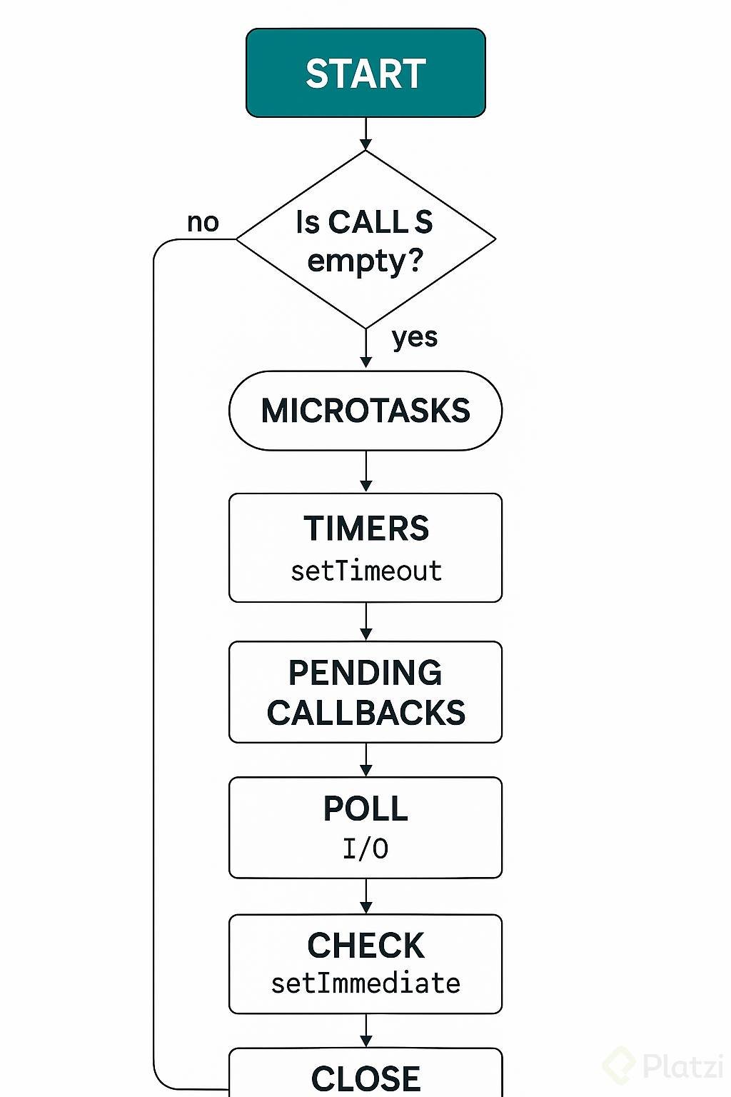 - Gestiona colas de callbacks y recibe nuevas instrucciones de ejecución asíncrona.