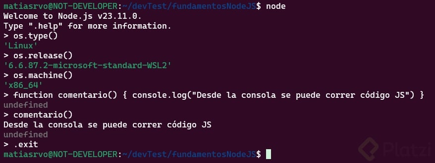 const os = require('os'); function showSystemInfo() { console.log('Sistema operativo:', os.type()); console.log('Plataforma:', os.platform()); console.log('Arquitectura:', os.arch()); console.log('Versión del SO:', os.release()); } showSystemInfo();