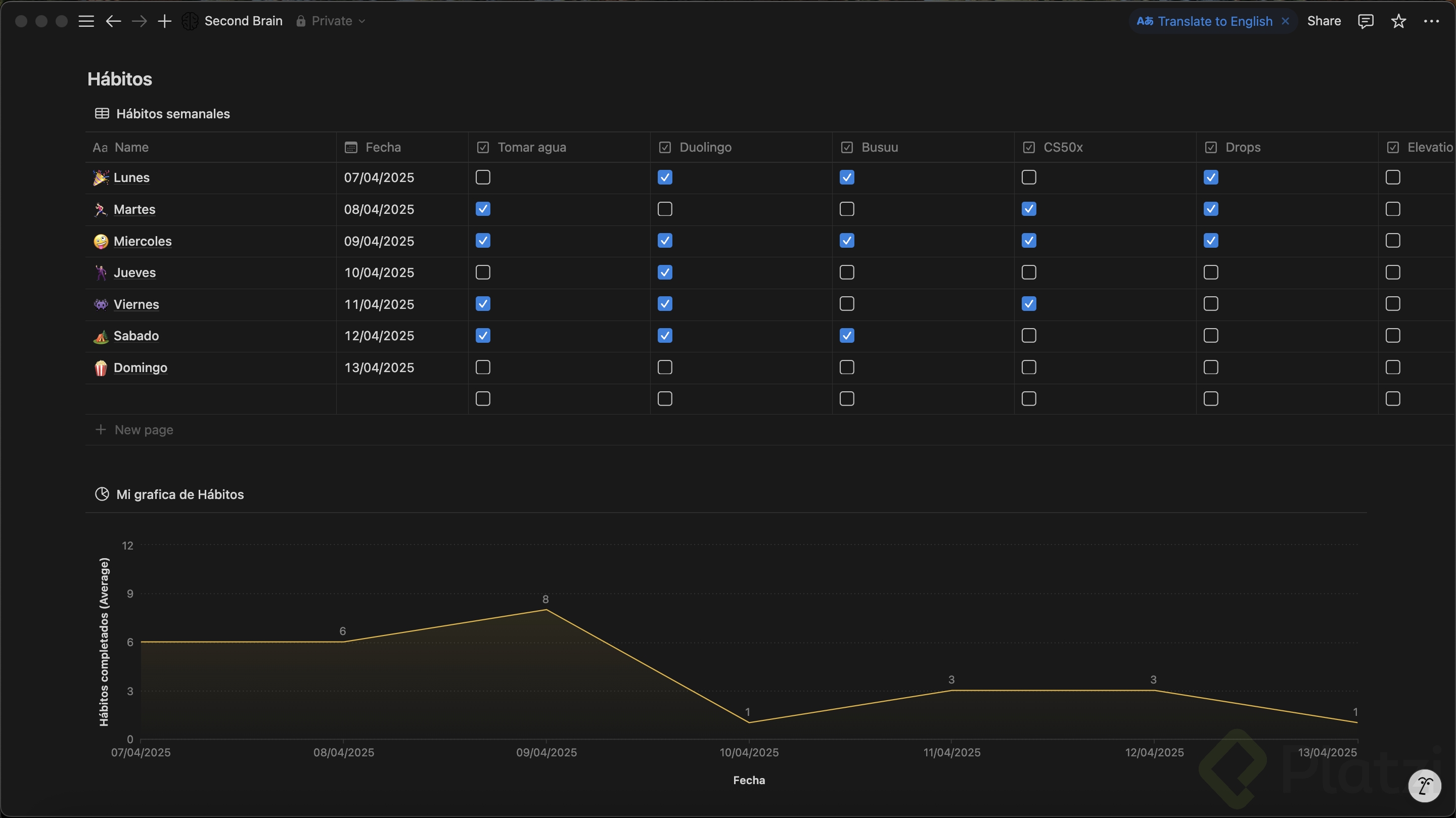 Agregar propiedades: Crea propiedades para cada hábito que deseas seguir, como "Despertar temprano", "Tomar dos litros de agua" o "Ejercicio". Usa casillas de verificación para marcar la realización de cada hábito.