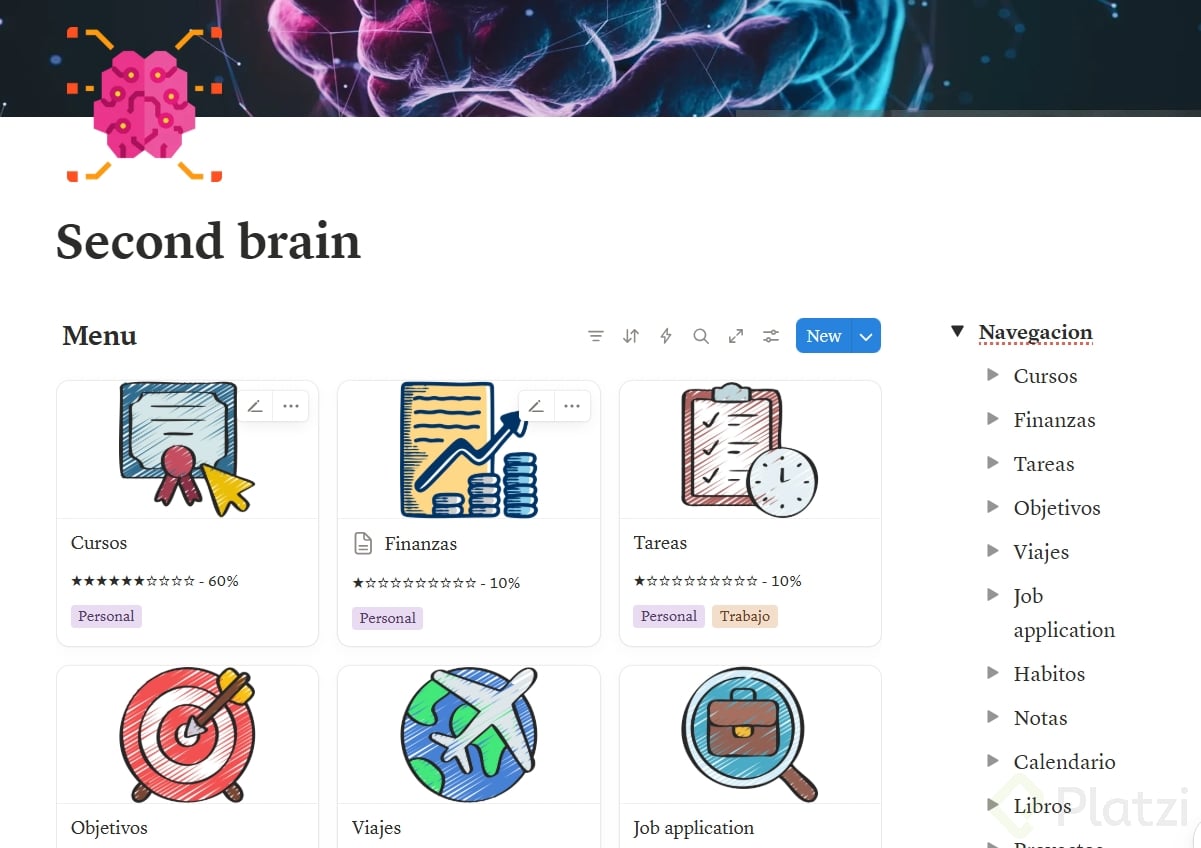 Con estas vistas configuradas, la sección general del second brain queda completa. Tienes una vista "Todos" que muestra la totalidad de las tarjetas, y vistas específicas que te permiten navegar por categoría con un solo clic [2:40].