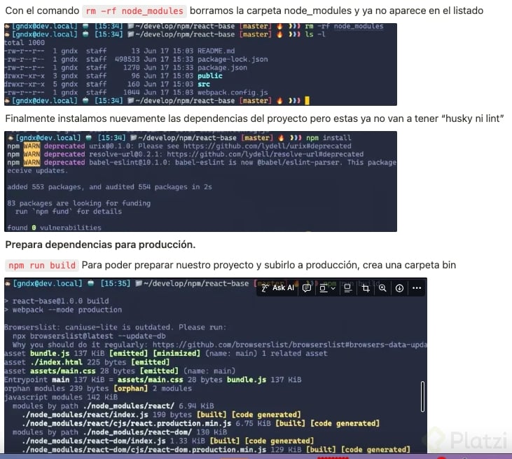 Por lo tanto, deberás eliminar el directorio de node_modules y después ejecutar el comando npm install para instalar correctamente los paquetes. En ciertas situaciones, también es necesario eliminar el archivo package-lock.json.