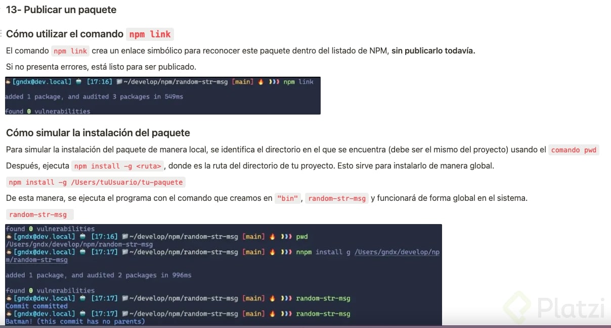 El comando sudo npm link crea un enlace simbólico para reconocer este paquete dentro del listado de NPM, sin publicarlo todavía.