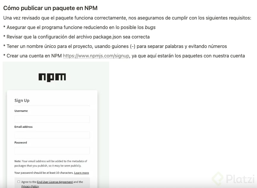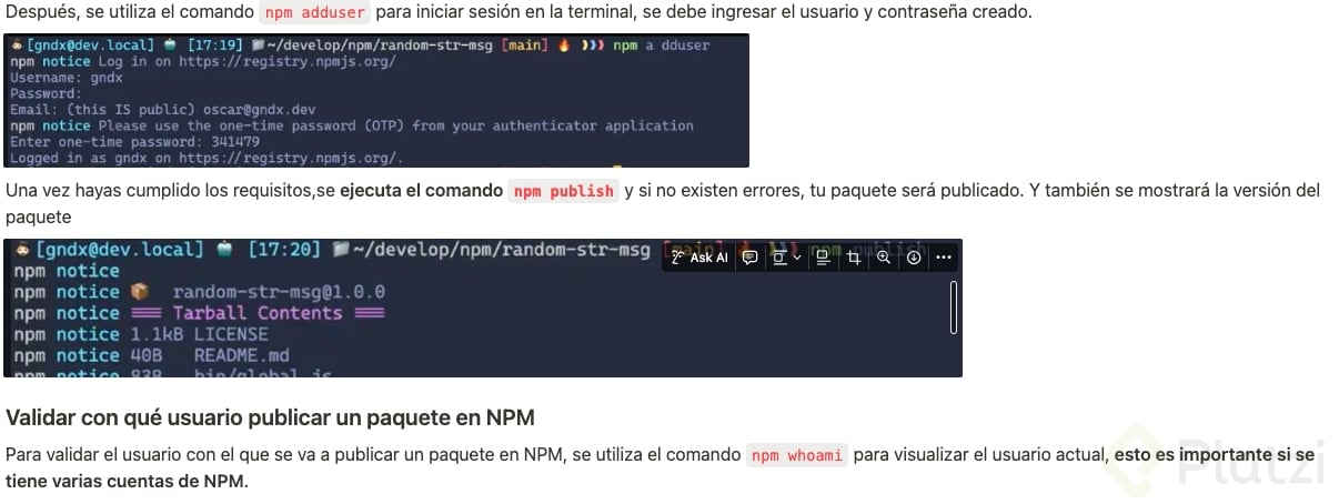 * Crear una cuenta en NPM, ya que aquí estarán tus paquetes a tu nombre. Después, debes utilizar el comando npm adduser para iniciar sesión en la terminal. Llena los datos, si no aparece tu contraseña, no te preocupes, es una forma de seguridad.