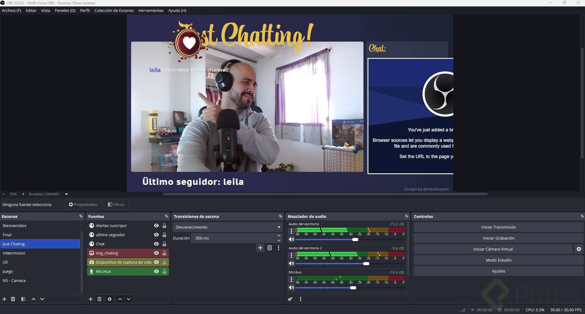- Crear y ajustar escenas: Crea diferentes escenas como "Just Chatting", "Intermission" o "Gameplay" y asigna los sources correspondientes.