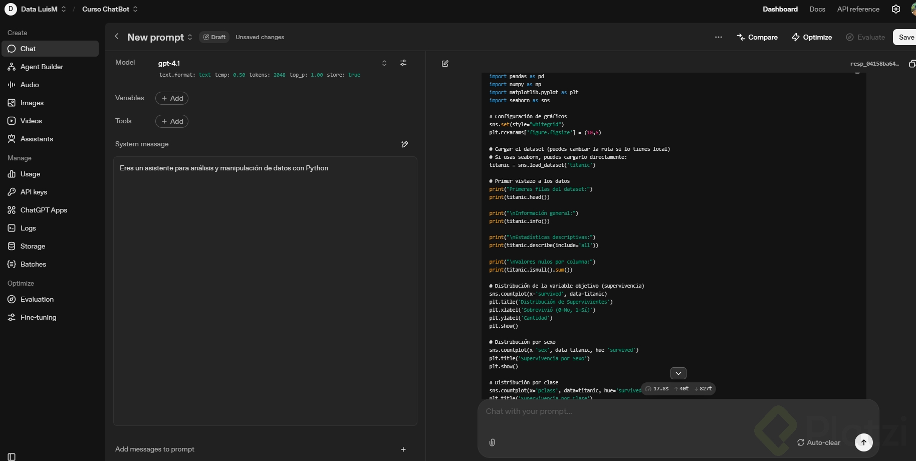 En el modo chat podrás utilizar modelos tipo chat como GPT-4. Encontrarás las siguientes secciones para interactuar con el modelo: