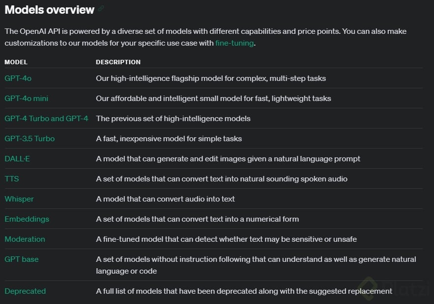 En la documentación sobresalen los modelos como GPT-4 y GPT-3.5, cada uno con capacidades únicas, como Whisper, un modelo transformador de audio a texto. Conocer las diferencias y aplicaciones de cada modelo te permitirá elegir el más adecuado para tus proyectos.