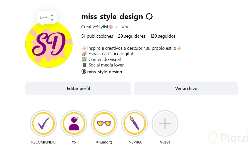 Para una marca, una abstracción visual simplificada del logo es la mejor opción. Evita apilar todas las partes de un logotipo para que quepan; en su lugar, enfócate en una representación que sea legible incluso en tamaños pequeños. Platzi, por ejemplo, utiliza una abstracción de su nombre que es fácil de reconocer y consistente con su branding.