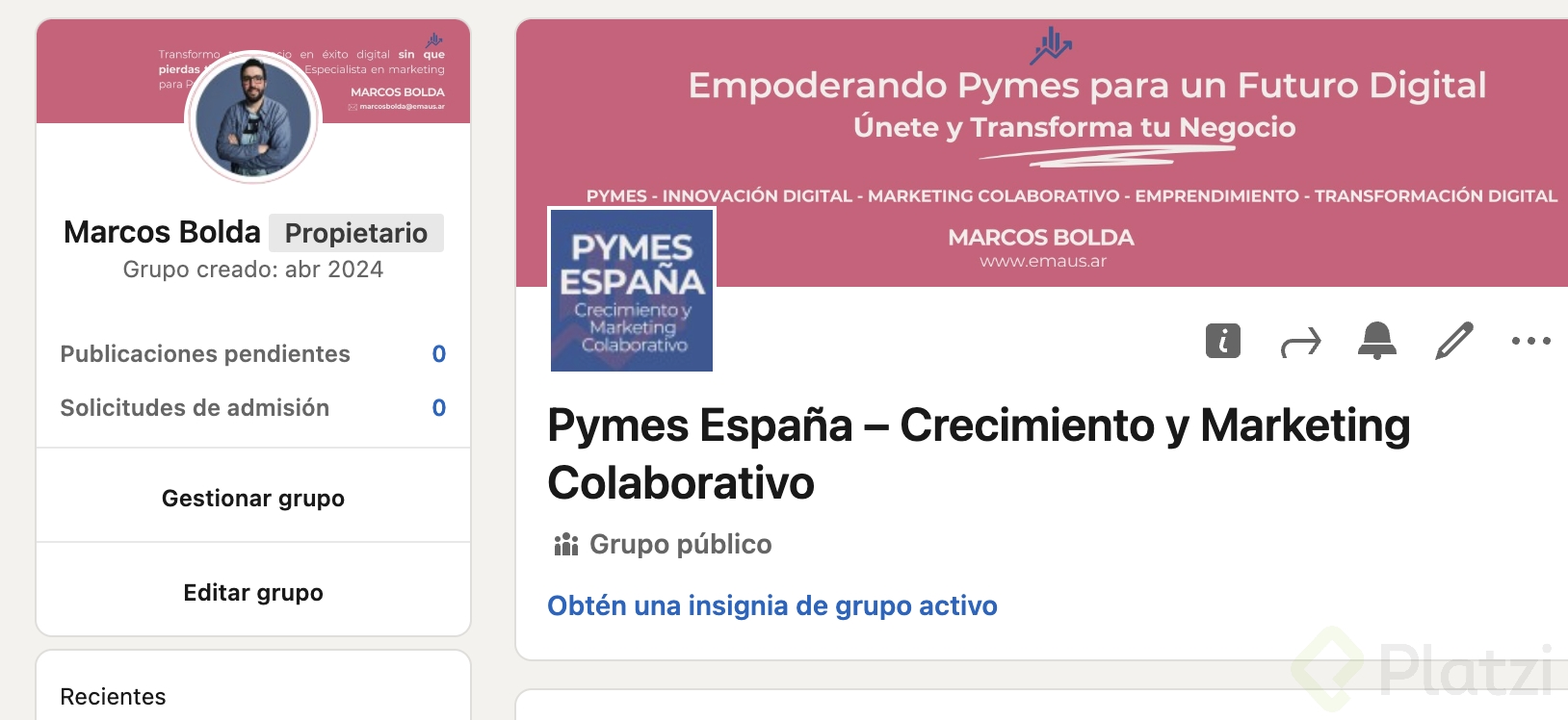 - Banner y portada: Diseña un banner claro que refleje el propósito del grupo y que invita a unirse a la comunidad. Incluye entre tres y cinco conceptos clave que representen los temas discutidos en el grupo.