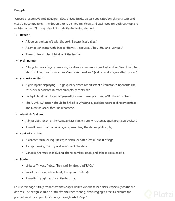 Una vez que tenemos claro lo que queremos, el siguiente paso es utilizar ChatGPT para generar el código HTML, CSS y JavaScript necesario. Para ello, redactamos un prompt detallado que especifique nuestros requerimientos. Por ejemplo, si necesitamos que el código incluya un título, una sección con cinco productos destacados y botones que dirijan a WhatsApp, esto debe estar claramente descrito en el prompt.