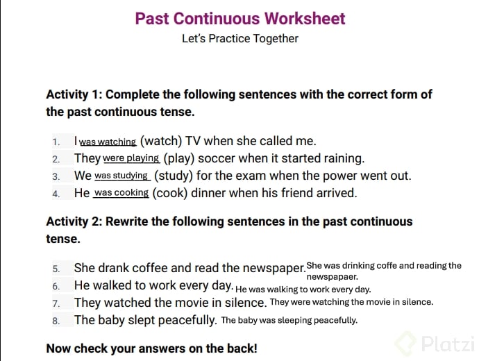 Estas preguntas te impulsan a usar el pasado continuo y examinar cómo las acciones pasadas se conectan con el presente. Además, siempre puedes descargar hojas de ejercicios para practicar aún más.