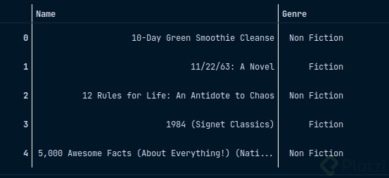 Por ejemplo, simplemente al imprimir las cinco primeras filas del DataFrame con las columnas de Name y Genre se tiene este resultado.