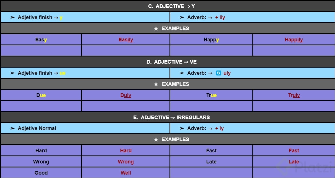 No todos los adverbios siguen estas reglas; algunos son irregulares. Por ejemplo, bueno se convierte en bien, y algunos adjetivos como tarde o rápido no cambian: "Alexa, teclea rápido."
