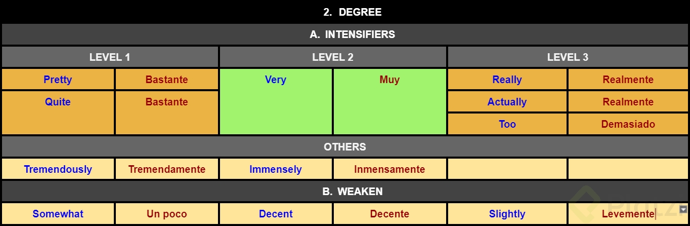Estos adverbios describen la intensidad o el grado de una acción o cualidad. Podemos usarlos con verbos, otros adverbios y adjetivos para enriquecer el sentido de las oraciones.