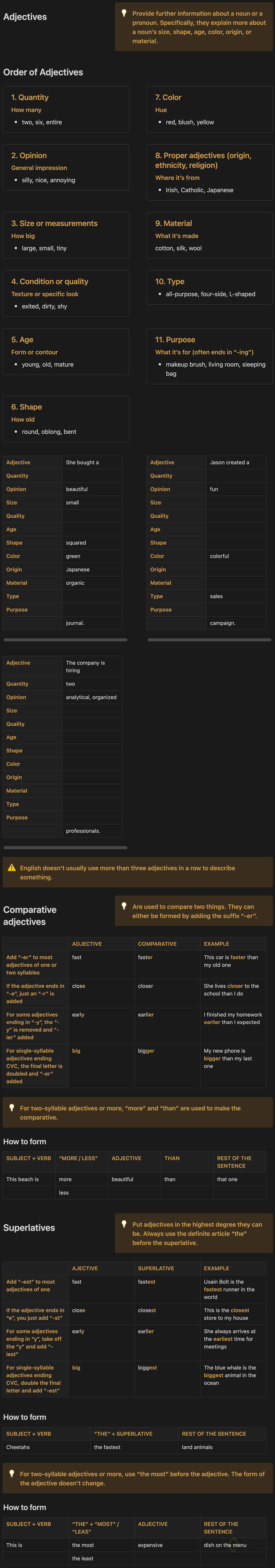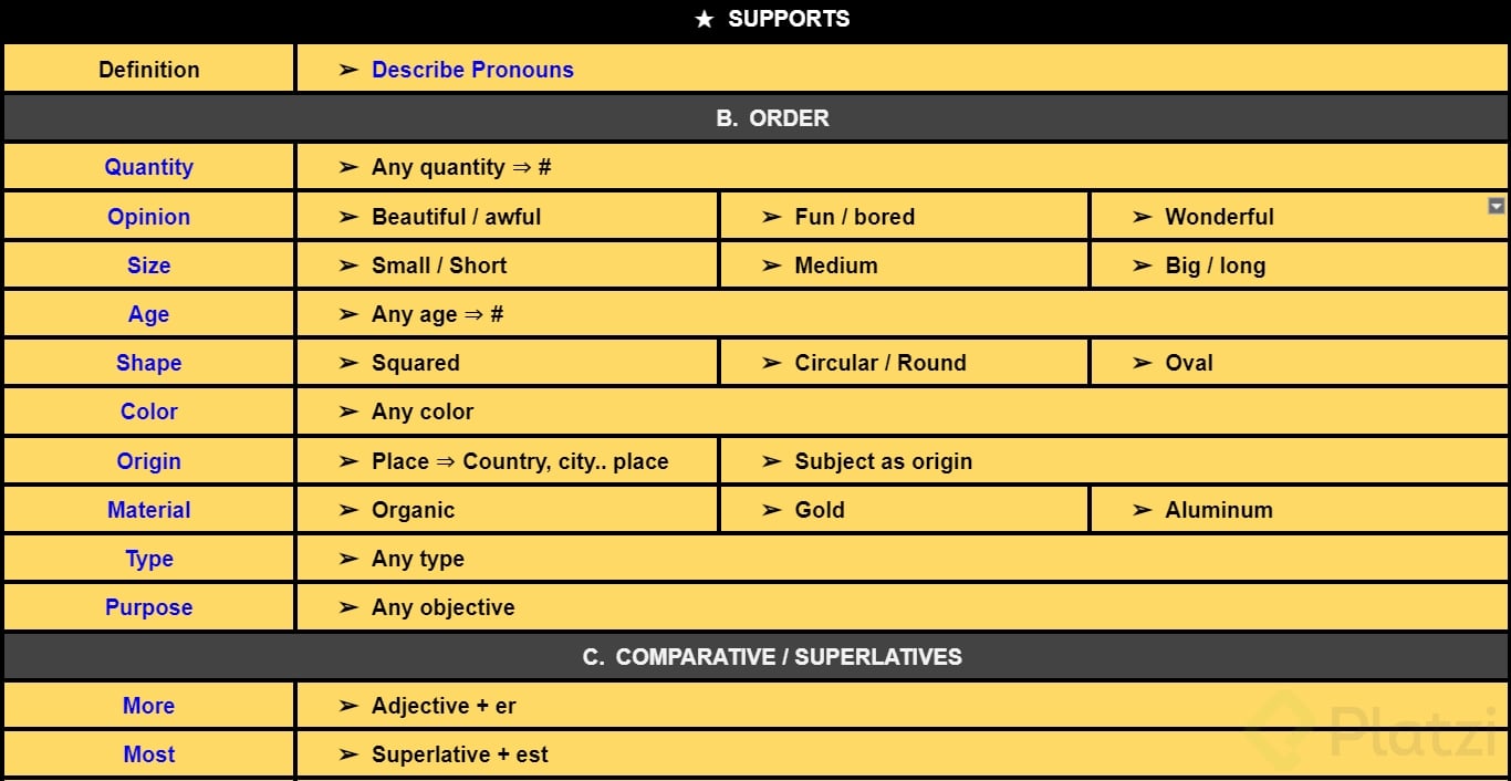 Por ejemplo, al describir un objeto con múltiples características: "Leah escribió cinco fuertes párrafos cortos". Aquí, cinco refiere a cantidad, fuertes a una opinión y cortos al tamaño.