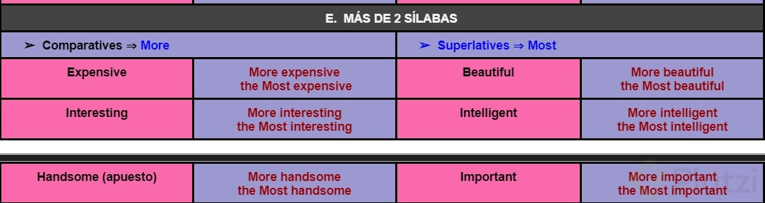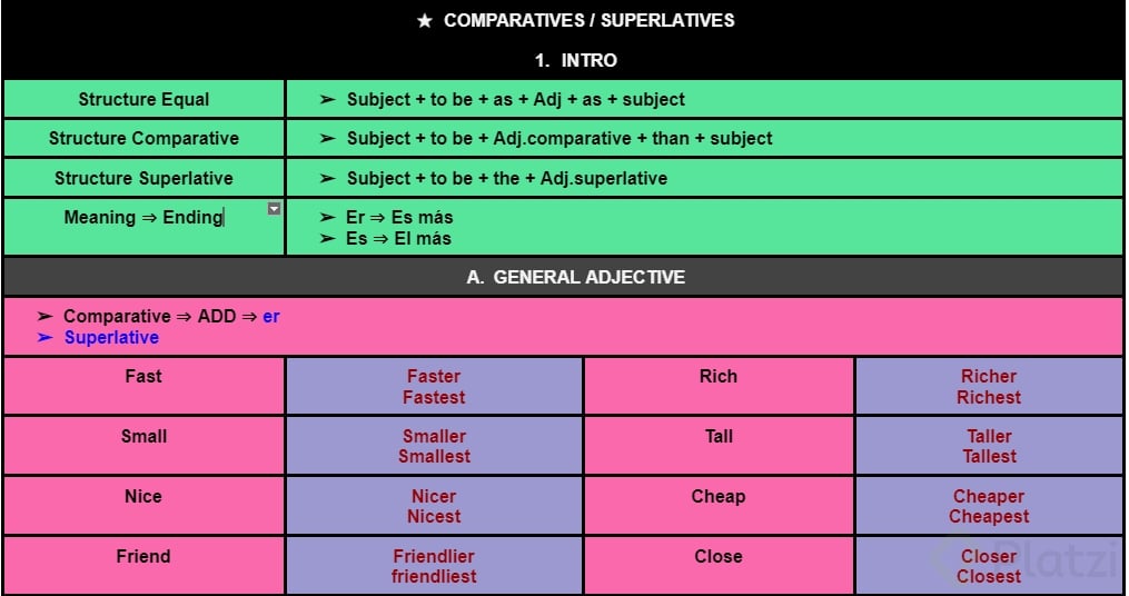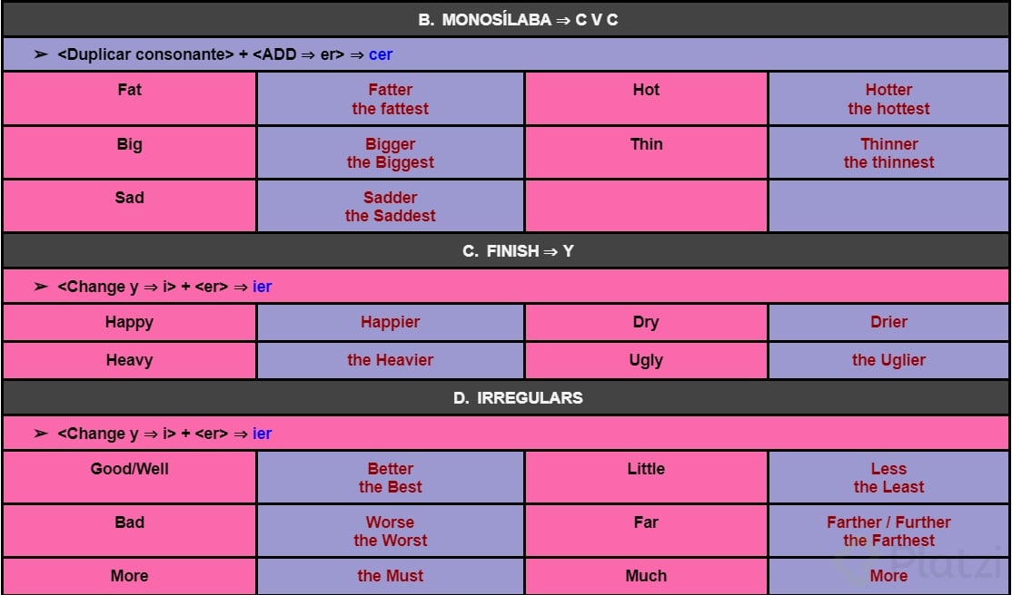 Adjetivos Comparativos: Sirven para señalar diferencias entre dos cosas o personas. Por ejemplo, si un adjetivo tiene una sílaba, se añade er seguido de "than" en inglés (esta aplicación es más rápida que aquella). Si el adjetivo tiene más de una sílaba, se antepone "más" y se utiliza que para la comparación, como en "Henry es más puntual que Mia". Una particularidad es que si el adjetivo termina en Y, se cambia por I, se añade er, como en "Peter está más ocupado que yo".