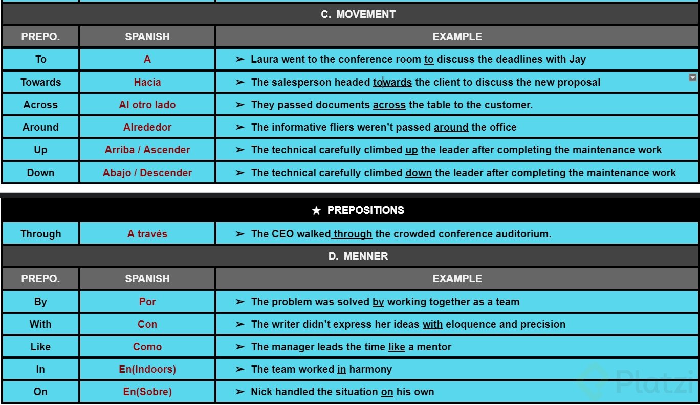 - Ejemplo: Laura fue a la sala de conferencias para discutir los plazos con Jay, en donde las preposiciones de movimiento "a" y "hacia" nos indican el destino de Laura.