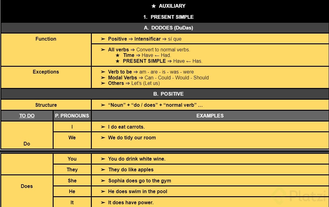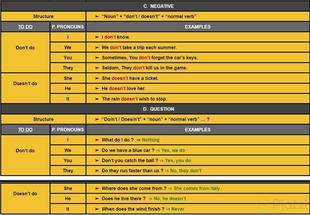 - Do: construye negaciones e interrogaciones en present simple. Ejemplo: "I don't have meetings in the mornings" [0:55].