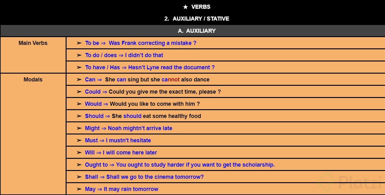 Además de los tres principales, existen los modal auxiliary verbs, que expresan probabilidad, peticiones o obligaciones [1:22].